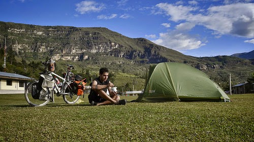 Quique Morales viaja o viajaba con su compañera, ya que esta se ha bajado de la bici, después de haber rodado desde Alaska hasta entrar en Sudamérica. El blog se llama Coleccionando Atardeceres y Quique también es un excelente fotógrafo. Su blog  http://coleccionandoatardeceres.blogspot.com.es/ es altamente recomendable.